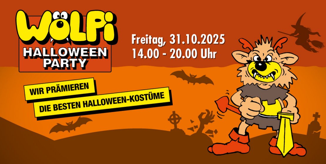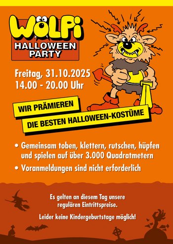 Am Dienstag, den 31.10.2025 findet von 14.00 - 20.00 Uhr wieder Wölpi's beliebte Halloween-Party statt!